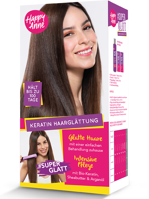Die neue Keratin Haarglättung von Happy Anne ist ein Komplett-Set, welches Deine Haare glättet und pflegt. Einfach und unkompliziert zu Hause - und das bis zu 100 Tage lang!